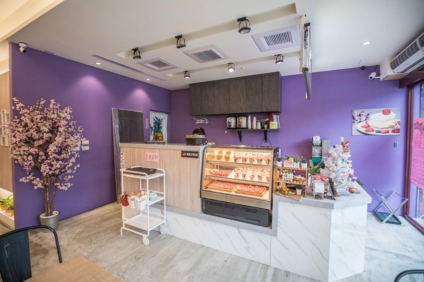 走進旺來冰館,用餐環境相當寬敞舒適,裝潢配色是用亮色系顏色,感覺很年輕活潑,櫃檯處是夢幻的紫色,冷藏櫃內放了許多當季的水果,現在是草莓的季節,冷藏櫃裡冰了滿滿的草莓