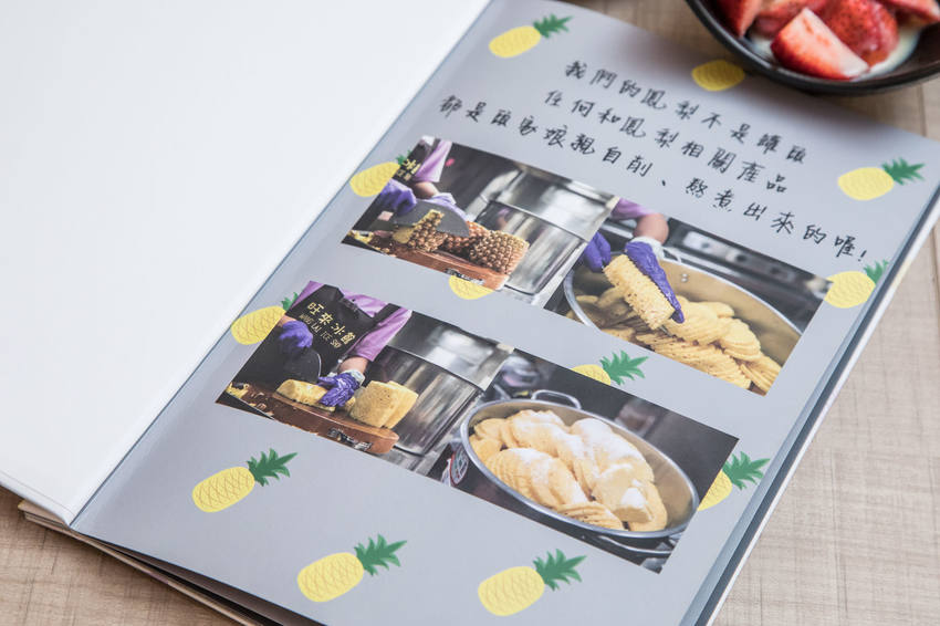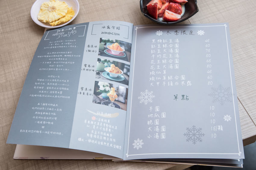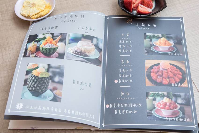 旺來冰館的菜單,簡單有質感的設計很可愛,第一頁就是介紹旺來冰館的鳳梨,旺來冰館的冰品種類也很多樣化,水果類堅持只用鮮果,連果醬糖水都是自製,完全不假他人之手,堅持自己敢吃才敢賣給消費著的良心經營理念,且會根據季節推出不同的水果冰,不知道當季盛產什麼水果,看老闆賣什麼冰就知道啦
