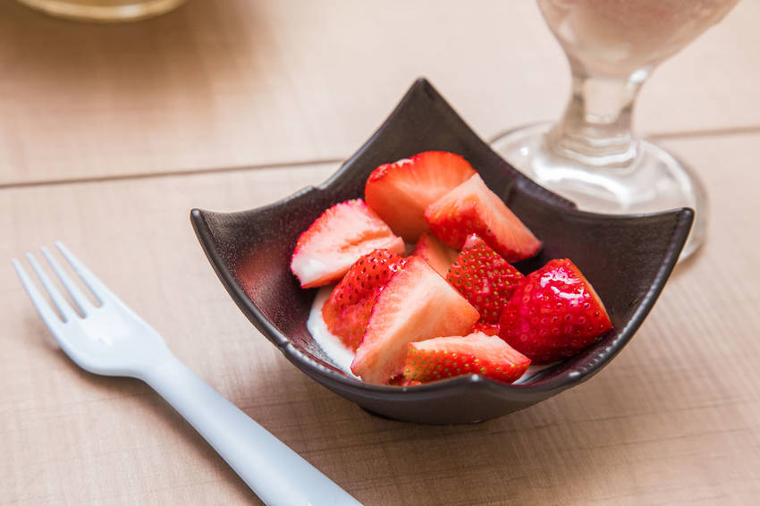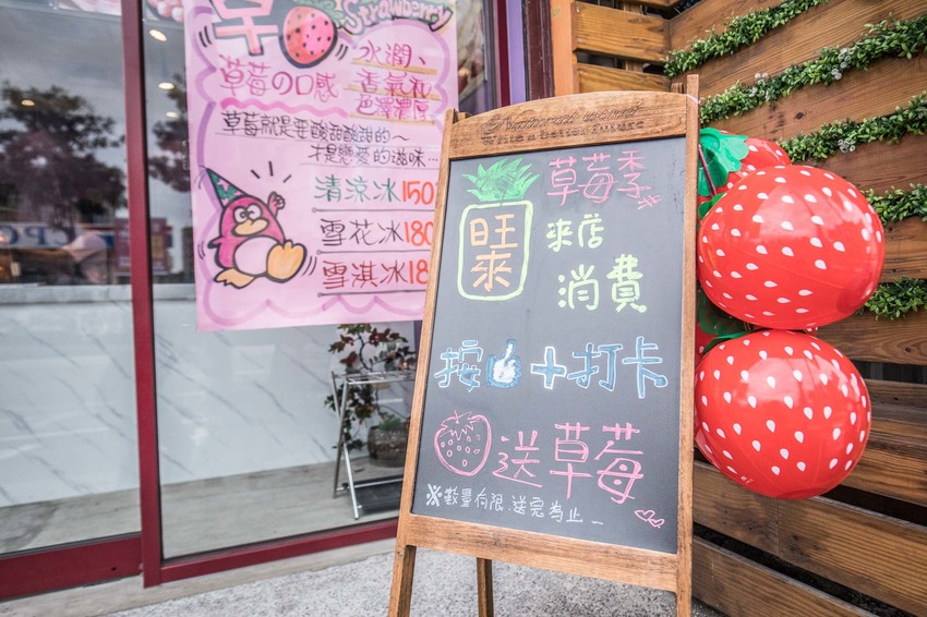 門口處的小招牌寫著當日優惠,冬天是草莓的季節,老闆也不吝嗇,打卡直接送你草莓吃啦!