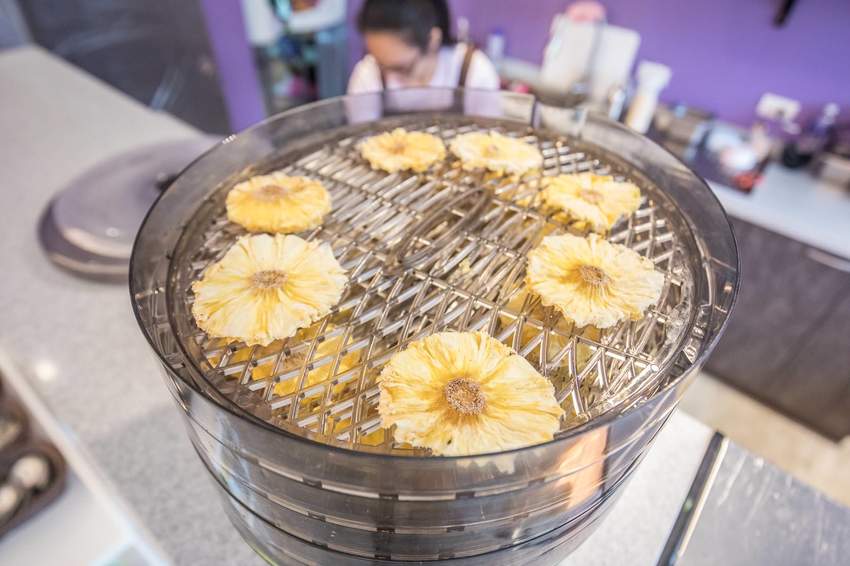 咬咬眼尖發現櫃檯上有一個烘果乾的機器,既然叫旺來冰館,主打的就是鳳梨冰囉!堅持不用罐頭鳳梨,在店內只要是鳳梨相關的產品,全部都是旺來冰館親力親為,買整顆鳳梨回來切削處理,保證純天然健康,不添加化學調味品