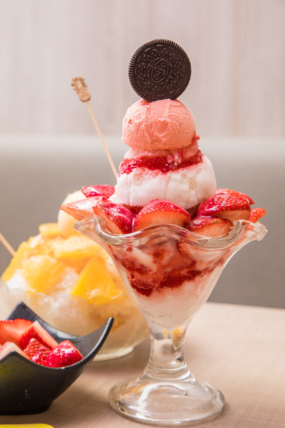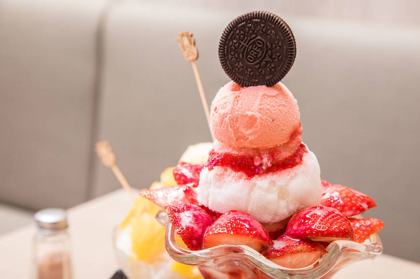 草莓雪淇冰的造型是聖代的造型,上面草莓整齊排列堆疊,放上一球草莓冰淇淋再淋上煉乳,上面再放一片oreo餅乾,少女心大噴發!