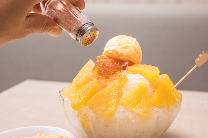 另一種吃法就使撒上玫瑰鹽,這也是旺來冰館所獨創的吃法,就跟吃西瓜加鹽的道理一樣,加了鹽鳳梨的甜度會更上一層樓!鹹鹹甜甜越吃越涮嘴,值得一提的是鳳梨冰的糖水是用自己熬的鳳梨糖水,讓整體口感更加一致完整