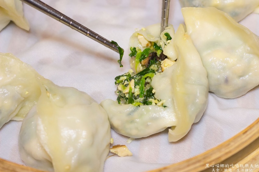 外觀看起來飽滿的花素蒸餃,裡面包了冬粉、蛋、香菇、豆干、菠菜(?),吃起來爽口又豐富,沾上辣椒蒜蓉醬油,為其增添香辣蒜鹹香。