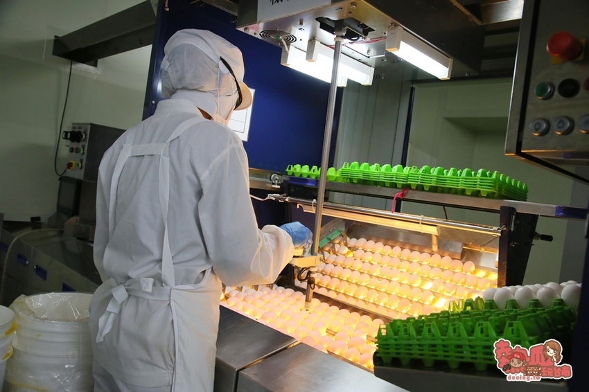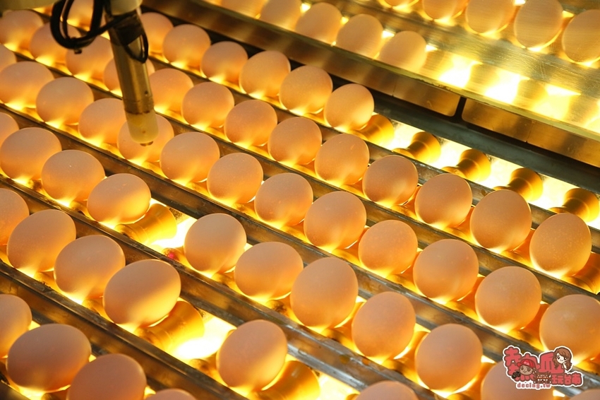 雞蛋經過蛋殼刷洗及風乾後,緊接著就是身體檢查的任務囉~透過燭光,每顆雞蛋排排站在檢驗台上,再以紅外線一顆顆檢查,透過紅外線找出雞蛋內有血絲、臭蛋等不良品~接下來還有聲納測血蛋偵測UV紫外線殺菌,期間不及格的蛋品直接被淘汰取出,共三個關卡測試雞蛋的完整品質。