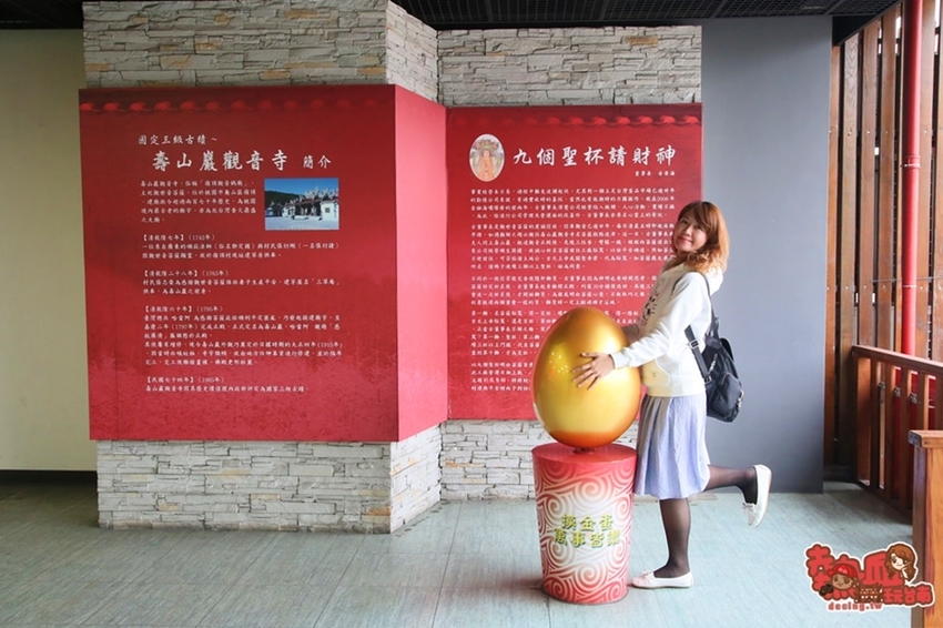 走進夢工場前,在廣場右側還有顆金雞蛋,這可是特別至壽山巖觀音寺擲了9個聖杯才請到的財神爺呢~設計成金雞蛋象徵發財金,因此來玩的人一定都會摸上幾下,就有機會沾喜氣得發財金哦~