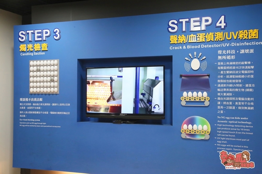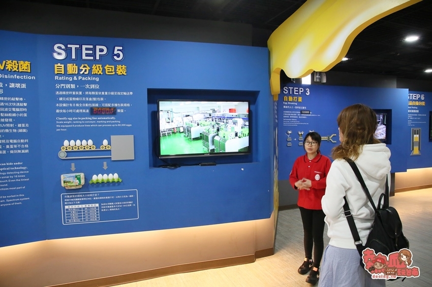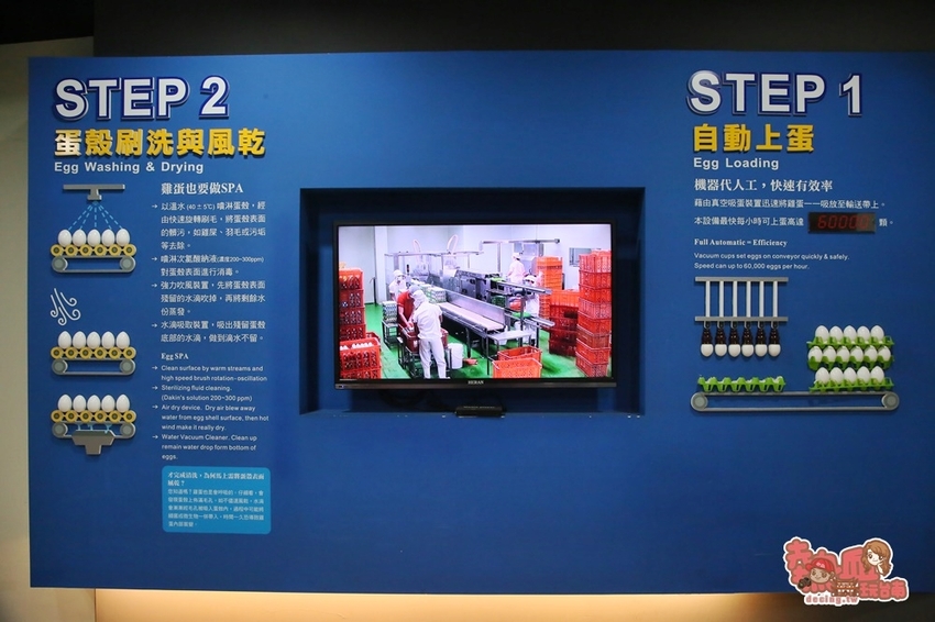 館內以影像及文字搭配簡述洗選蛋的製作過程,以機器取代人工,可以更快速又精準的完成作業,每小時最高可放置6萬顆雞蛋,實在是超酷啊!