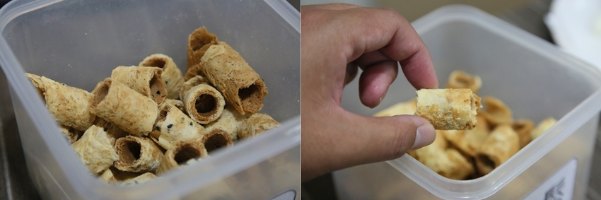想吃蛋捲嗎?這裡也提供蛋捲試吃,這次試吃到肉鬆蛋捲,那咀嚼在嘴裡的蛋香及肉鬆鹹香味,真的厲害又好吃,且蛋捲內的肉鬆份量還真的不少,肉鬆味道濃郁~好吃的讓熱血直接購買一箱,準備過年來送禮~