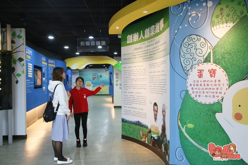走吧~先從右邊館內出發,這裡有著許多關於雞蛋的故事,並且以圖文故事的方式呈現,有趣的是從大壁報上可以發現,台灣人真的很愛吃雞蛋,台灣光是一天使用雞蛋的用量達到1800萬的份量,從早餐、中餐、晚餐、點心烘焙、零食等等,顯見大家真的非常愛吃雞蛋呢~
