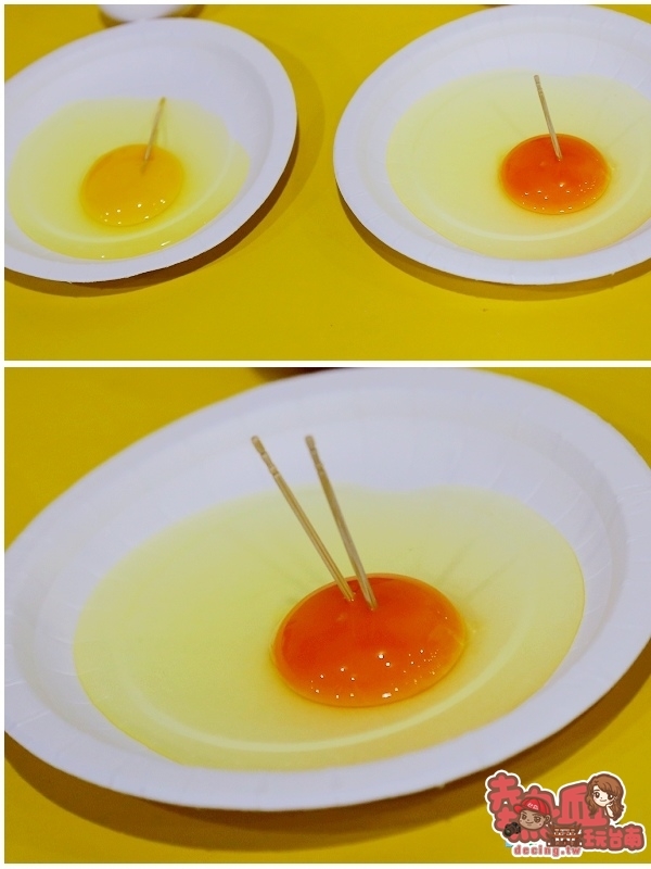 不僅如此,品管員還直接現場測試,拿出兩顆雞蛋來實驗~左邊是市售雞蛋,右邊則為勤億雞蛋,牙籤叉在左邊市售雞蛋無法挺直站立且明顯傾斜,再來看看勤億蛋品牙籤叉入後直挺的站立且接連叉入兩根都沒問題哦~