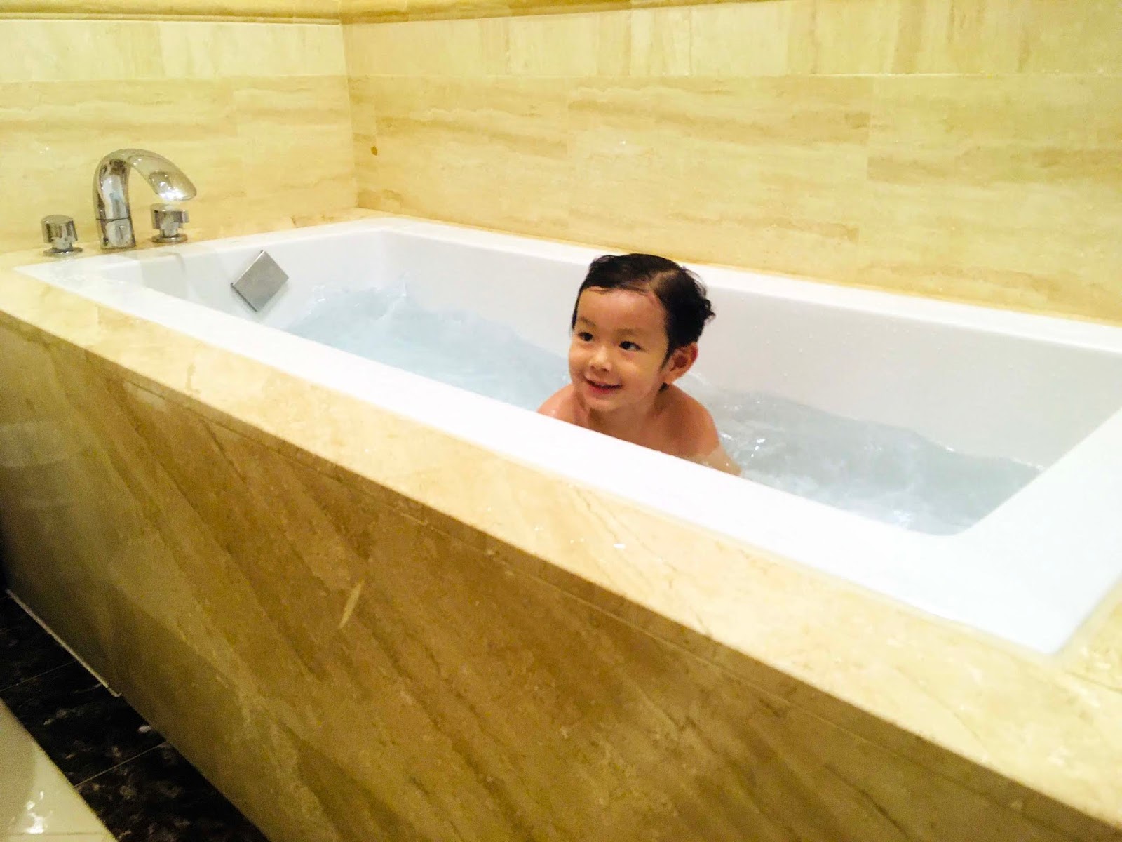 浴室是乾濕分離的設計,有淋浴間和浴缸,小福寶一看到浴缸就興奮地說:「我想玩水!」晚上我們放水給他泡澡,小福寶玩得超開心!小孩子果然很愛有浴缸的浴室。