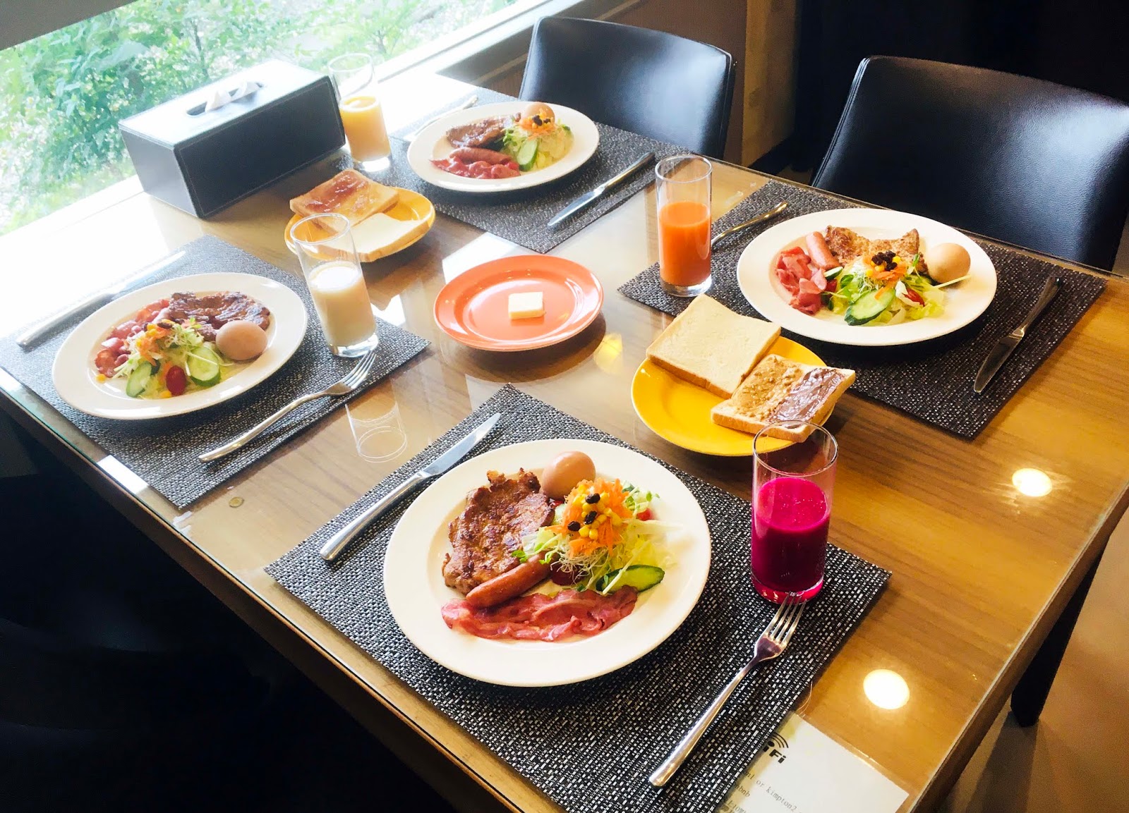 餐桌上的色香味俱全令人食指大動,以厚實多汁的豬排為主餐,搭配香脆的培根和德國香腸,給人一早就有大口吃肉的幸福感!再吃下滑嫩的水煮蛋及爽口的蔬果沙拉,營養滿分!