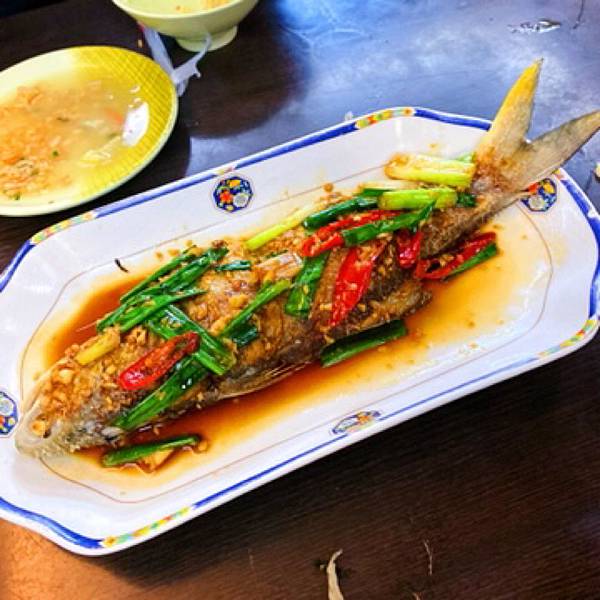 原來是將魚先簡單乾煎後 再加入蔥段 辣椒 大蒜去燒