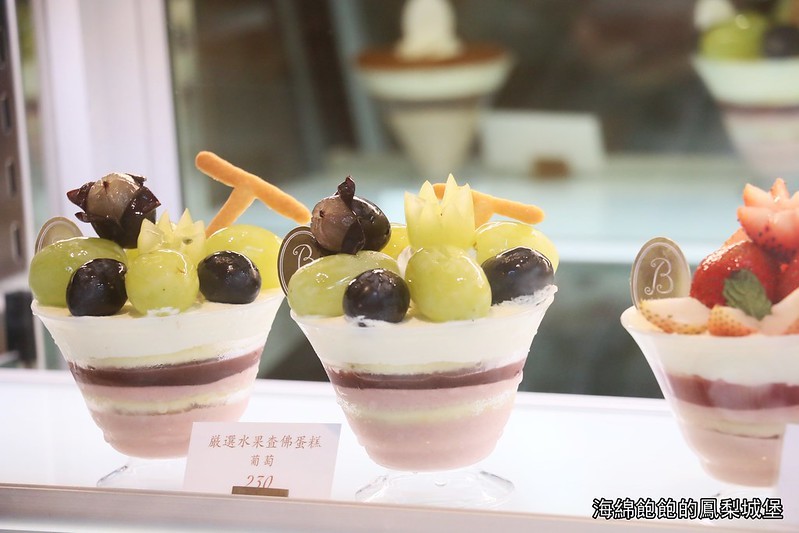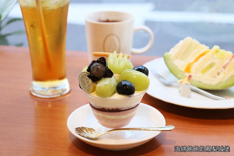 內有海綿蛋糕、鮮奶油、哈密瓜、草莓、葡萄...層層堆疊