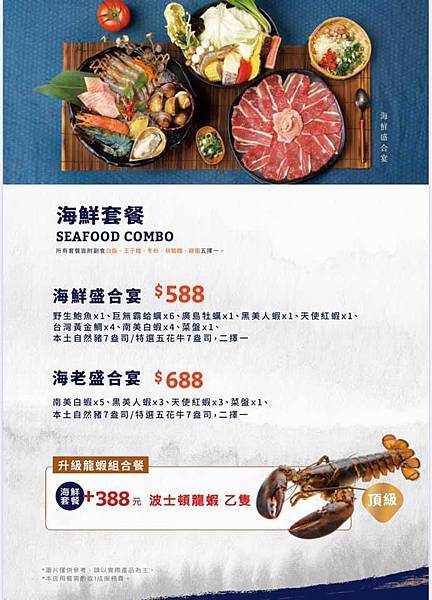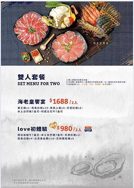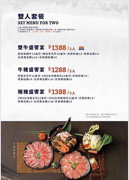 超豪華的雙人套餐來了!特選五花牛12盎司.1983台灣豬梅花12盎司.天使紅蝦*2.南美白蝦*4.台灣黃金鯛*1.巨無霸蛤蜊*6