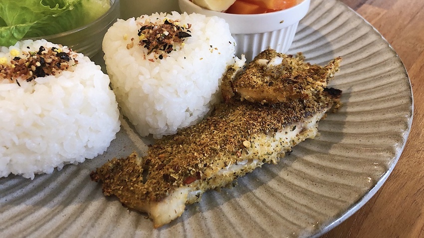 感覺菜米迦老闆人力真的相當吃緊啊,從點餐到最後出餐應該等超過了30分鐘吧,讓我一度以為是不是漏單或魚還沒釣到。除了主餐外還有生菜沙拉和餐後水果,加進腰果搭配吃起來清爽也帶點自然甜味。白飯壓成日式三角形飯糰並灑上了香鬆,鯛魚部分撒上滿滿義式香料味道相當濃郁,但以我自己口味來說好像就比較鹹一些。餐後甜點記得是焦糖優格解膩又好吃