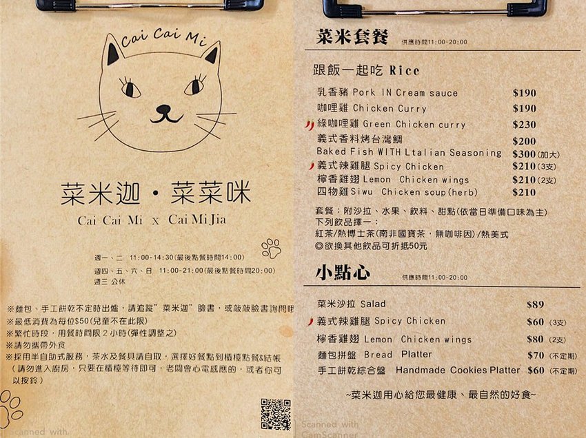 菜米迦店內菜單皆以套餐的形式販售,從早午餐歐姆蛋捲、特製烤餅、手工披薩,一直到各種飯食簡餐和小點心通通都有。但畢竟這間店又是在這麼低調的一個地方,對於沒有照片又是初次到訪的客人也會變得有點難做選擇,小建議還是可以將幾道招牌菜印出來,這樣也會比較好點餐喔