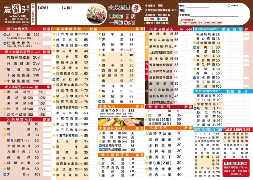 東山店的菜單如下:餐點有暖心大鍋、暖冬大補帖系列、小火鍋系列、火鍋單點系列、經典串燒系列、套整系列、招牌泡麵系列、飽食系列、小菜系列、飲料等等。