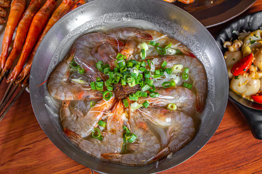 蒜蓉粉絲啤酒蝦,直接豪氣的加進整罐的藍妹啤酒,加上沙茶、蒜蓉、蔥花與冬粉搭配。