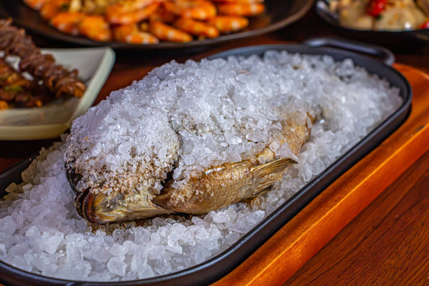 鹽焗鮮味台灣鯛,每天限量的烤魚,不刮鱗片用粗鹽包覆再進烤箱烤。