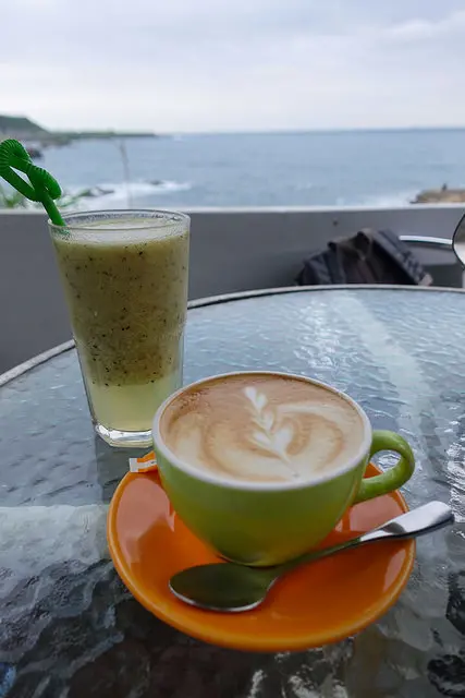 上星期週末到基隆走走,到八斗子車站我們下車覓食,路上一整排望去有好幾家cafe'或小餐館,其中有一家店蠻特別的,牆面用鮮明的黃色為底色,大大的字寫著店裡販賣的品項 : 茶、海鮮、爆米花!