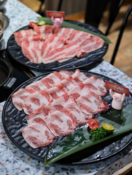肉盤則是梅花豬/牛五花/雪花牛三選一,每個肉盤都會有粉紅飛天豬舉著對應的小牌子方便辨識,貼心又可愛呢。