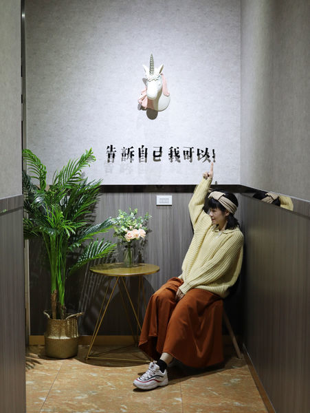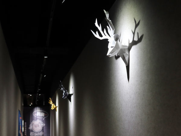 通往洗手間的走廊牆面裝飾著北歐感的造型鹿頭,還有夢幻的獨角獸。