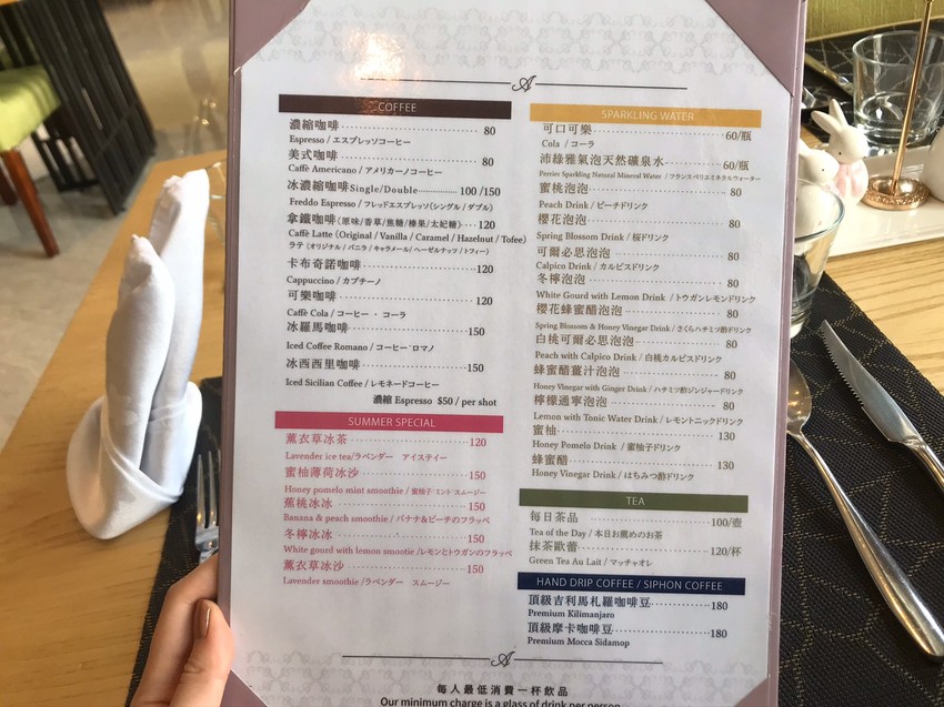 菜單為餐點與飲品分開,這邊低消是一杯飲品,其實不算高,所以如果想來單純喝杯咖啡也是可以的!