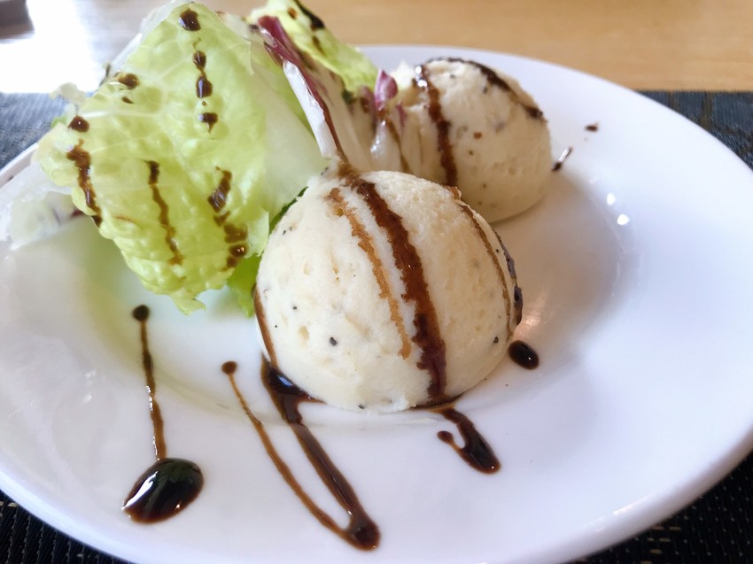 上面分別是套餐沙拉與配菜-馬鈴薯泥,沙拉的菜量頗多,生菜吃起來很鮮甜爽口,上面淋上橄欖油+巴沙米哥醋醬,我覺得有更提升生菜鮮甜的味道!