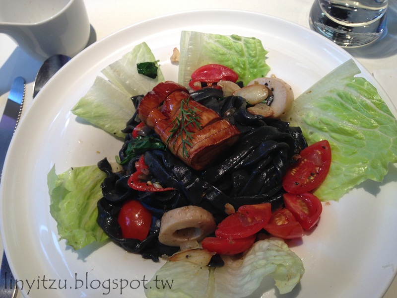 杏鮑菇做得有點像魷魚造型(?)竹炭麵是寬麵條,黑色的麵條感覺滿有魅力的。這道菜微微辣還頗開胃,口味不算清淡(好像有其他的麵真的比較淡),適合食量普通口味適中的人。