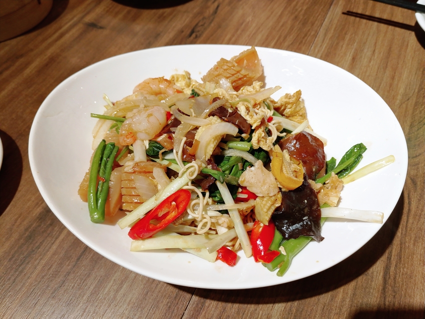 這滿滿的料有蝦子、魷魚、木耳、魚肉、青菜...等料,非常豐富👍