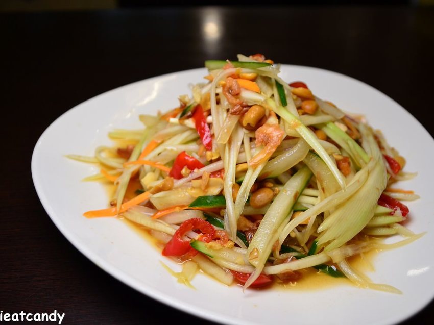 泰式料理最常出現的一道就是涼拌青木瓜,與特調羅望子汁調拌而成,辣度皆可請店家調整,爽脆青木瓜搭配辣中帶點酸、帶點甜的醬汁,及偶爾在口腔內出現的花生顆粒,很開胃。