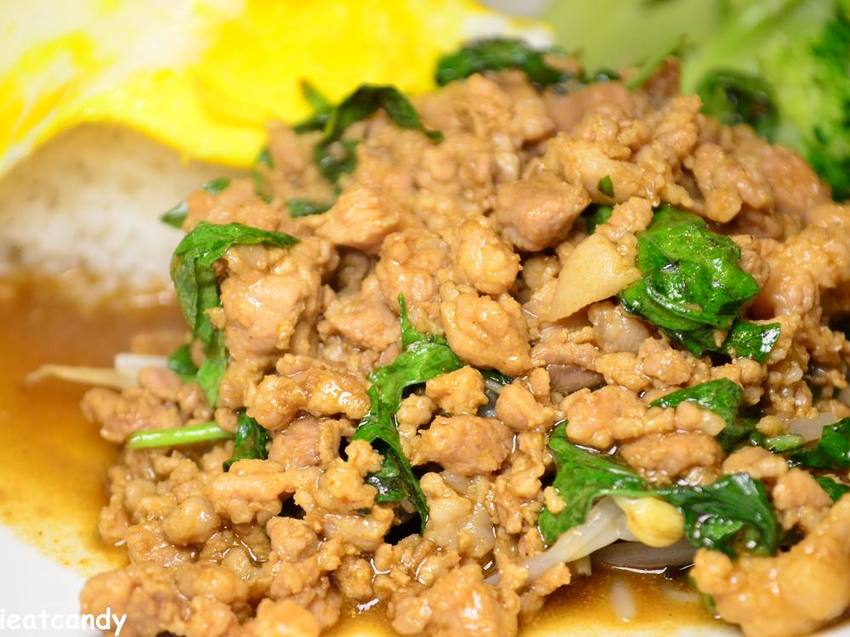 打拋豬肉飯因為是準備給小肥肉吃的,沒有加辣,不然,老闆娘通常會加乾辣椒一起拌炒,會更對味。而原味的打拋豬肉飯其實也有加些胡椒粉,但小肥肉還能接受,大家就斟酌是否要給小朋友吃。打拋豬以瘦肉為主,九層塔香氣及醬汁都有入味,雖然簡單、但仍有不簡單的美味呢!