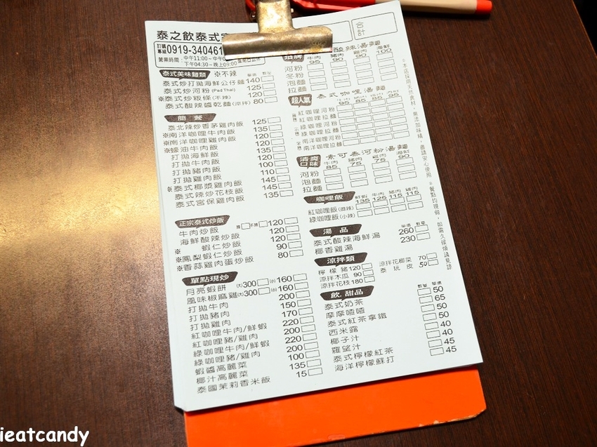 泰之飲泰式家鄉菜菜單:種類選擇很多,印象中的泰式料理這裡都有,可惜這裏沒有檸檬清蒸魚,聽老闆娘說做工太繁複,暫時沒有販售,但從以前就很熱銷的海南雞飯又重出江湖,讓許多老饕非常期待阿!在以下的餐點當中,愛伊特也會介紹喔~