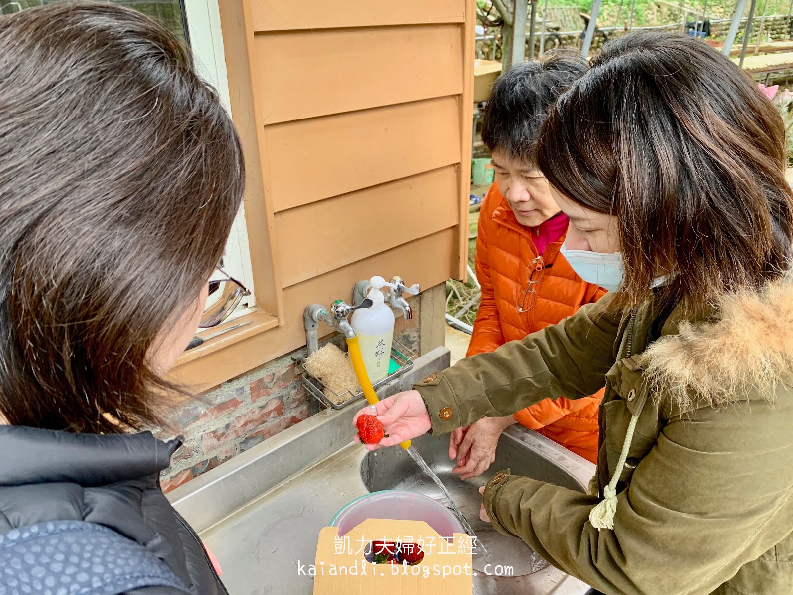 原來這邊採完後,店家有提供清洗的洗手台,還有巧克力醬或煉乳,真的是太貼心了,可以現採現吃喔。這邊計價是不分人頭的,每個人都可提一個小籃子跟剪刀,走入園內摘取自己喜歡的草莓。
