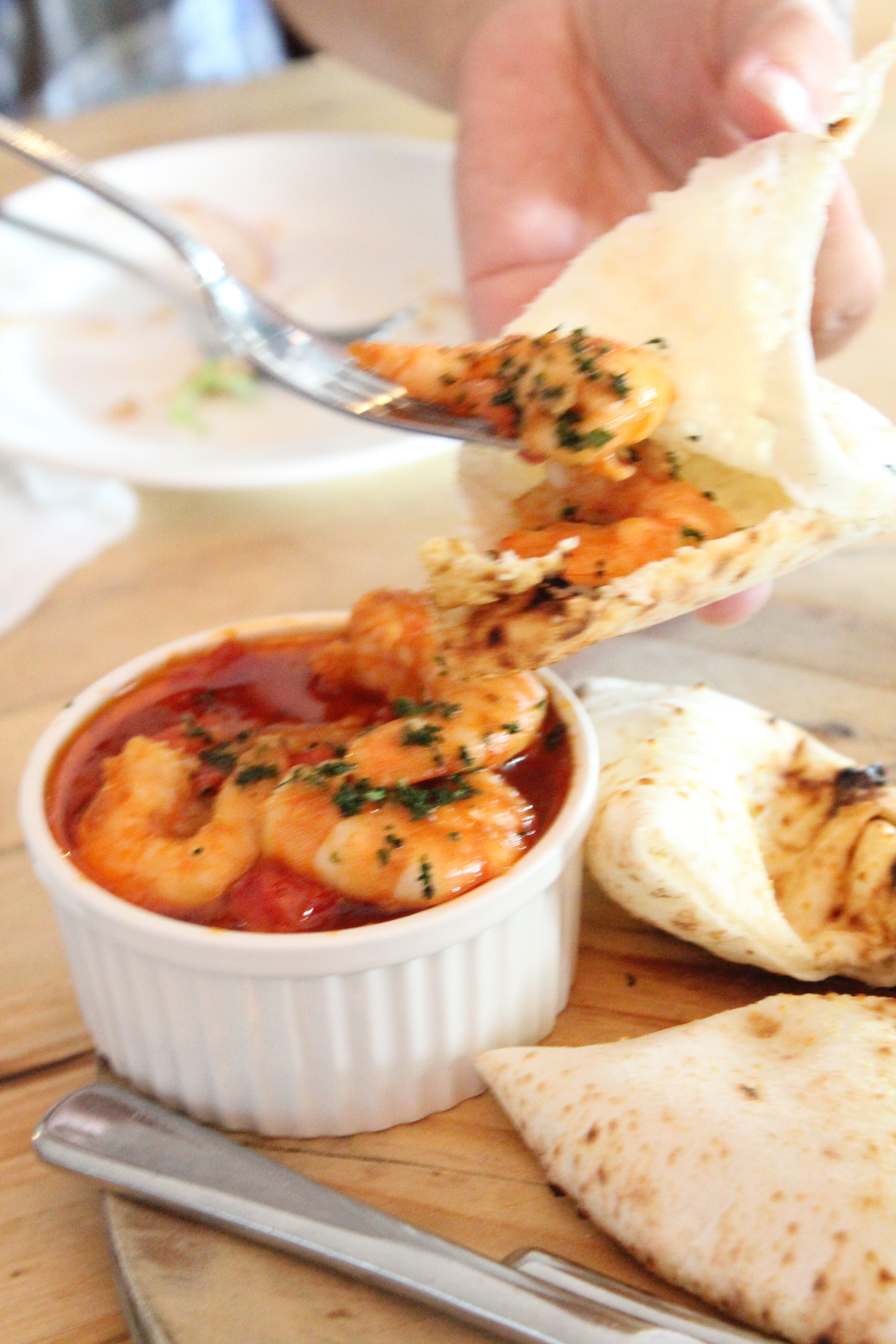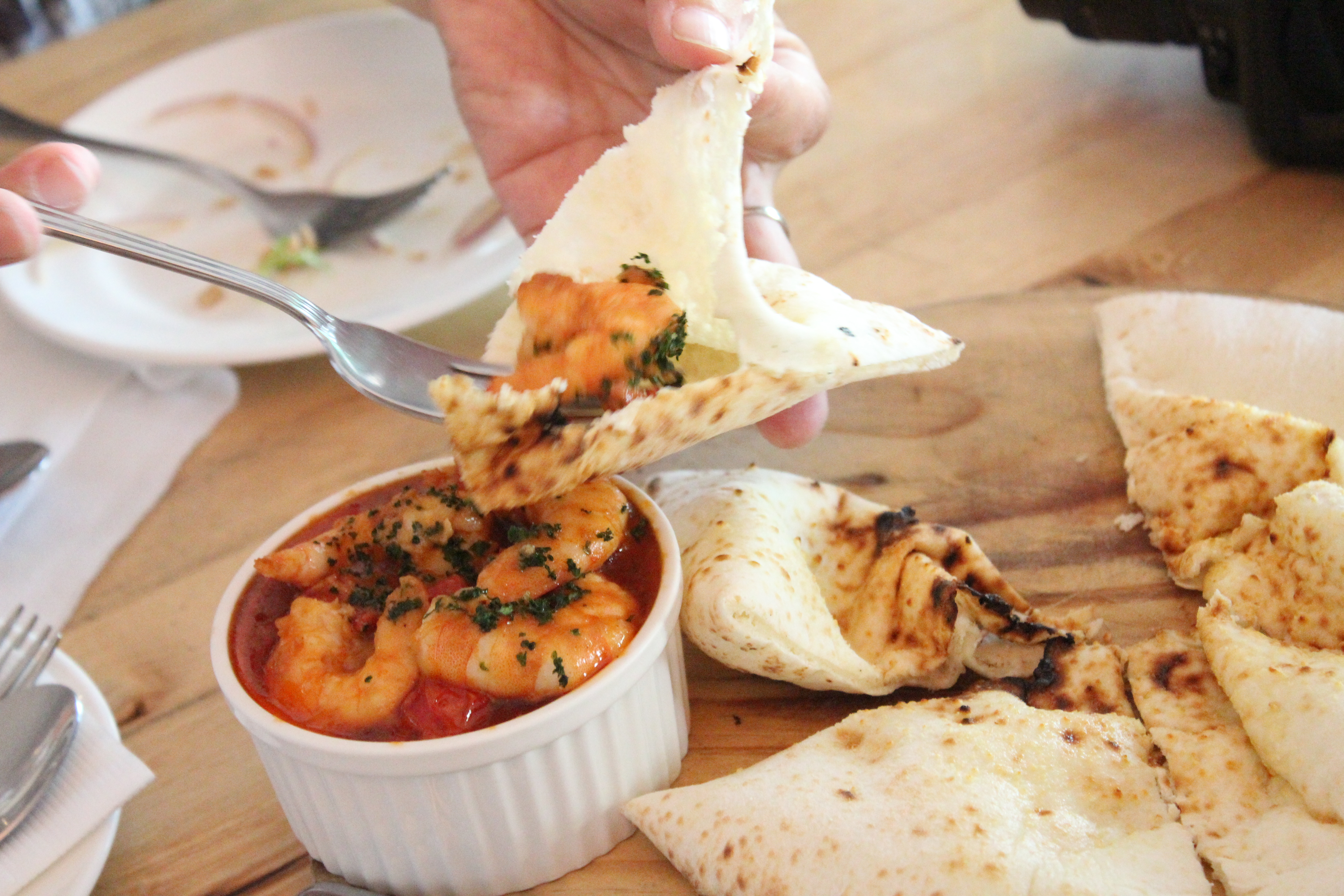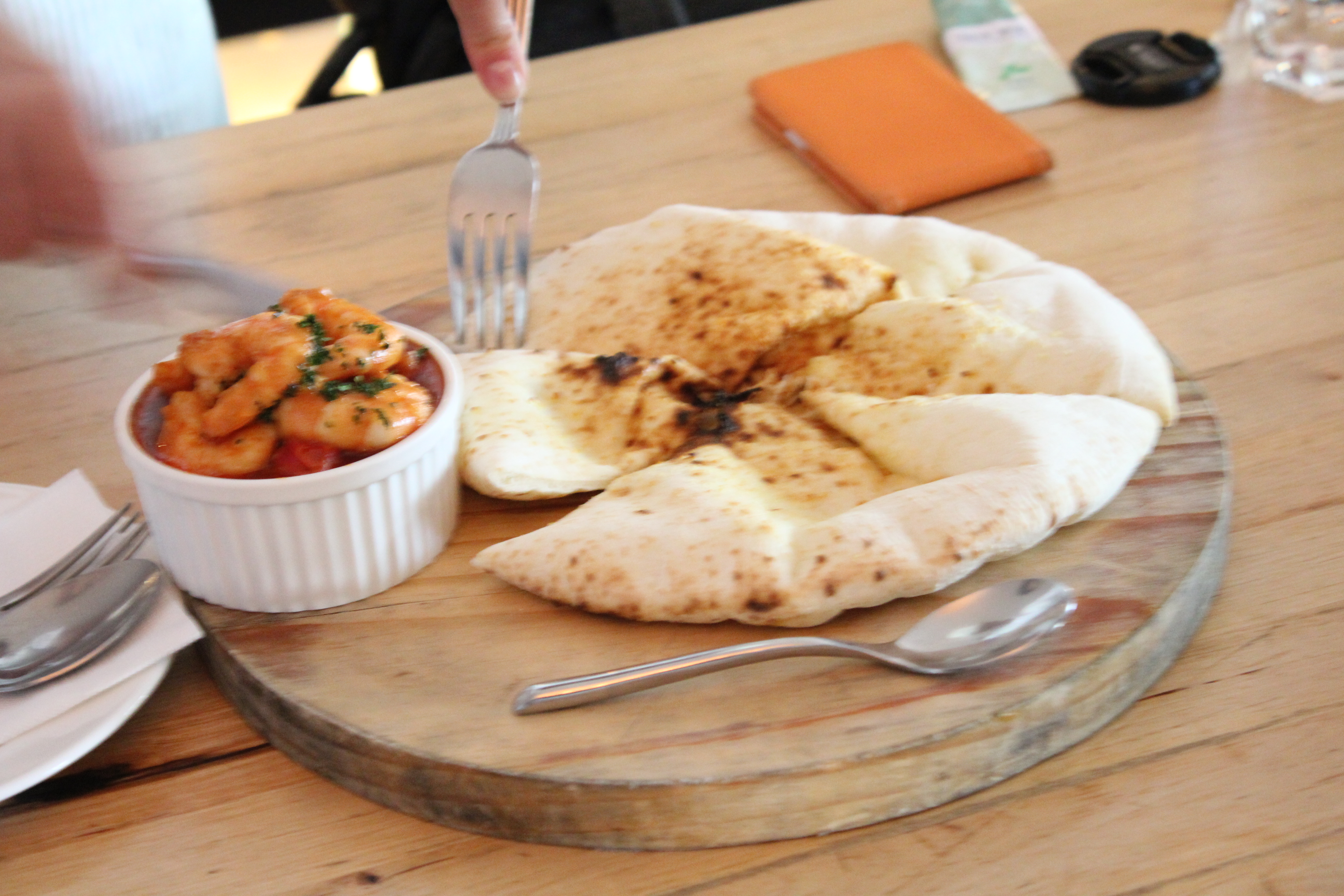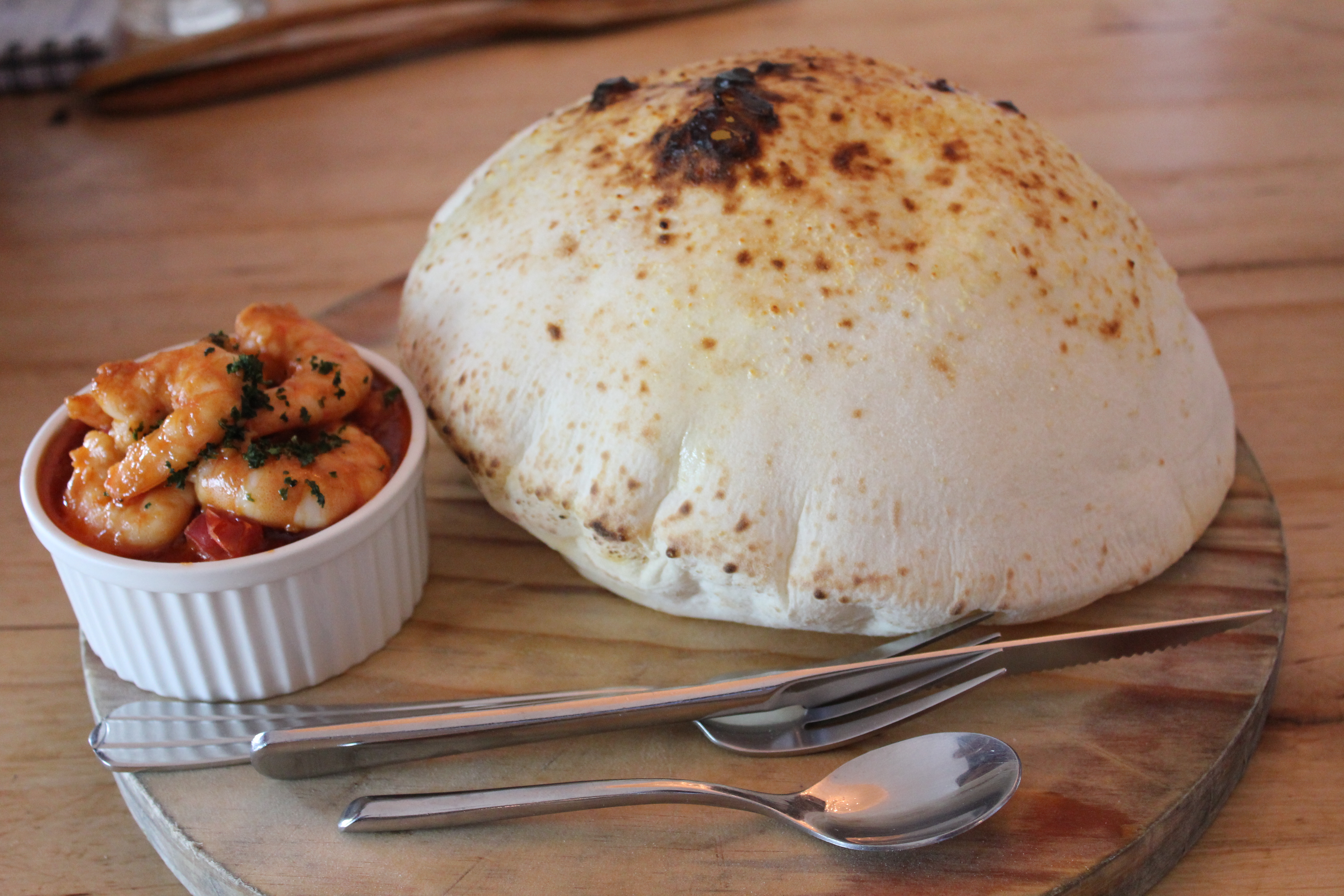 這道餐點出場時,我真的有點小驚喜,因為本輪我沒有吃過,再來是,它的餅皮與披薩皮相同,只是皮上面沒有放料,放進窯烤時,就自然膨脹。想拍照動作得快點,因為,很快就會消氣了。