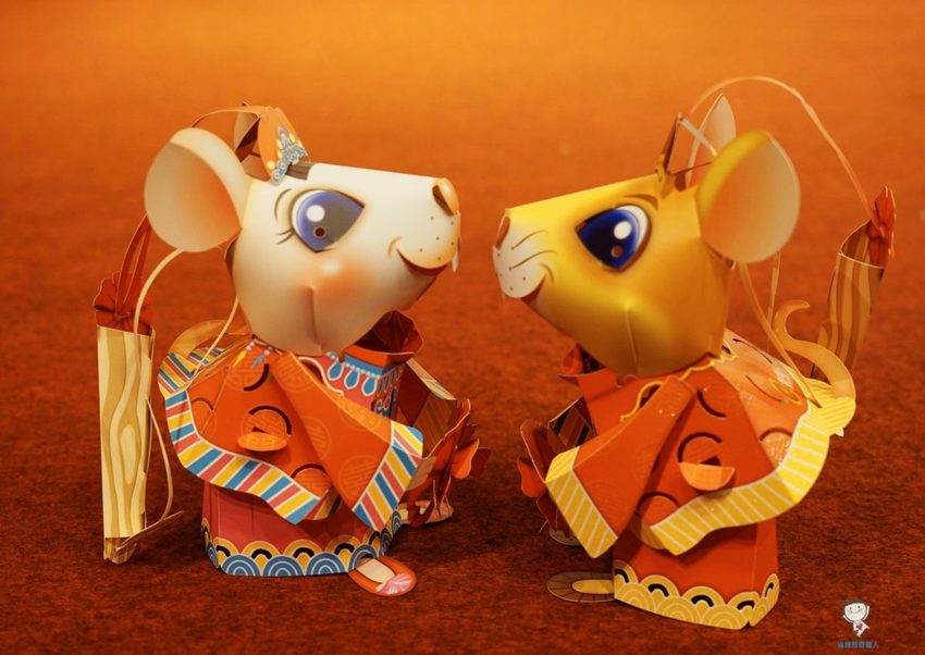 左邊的是美麗鼠,右邊的是吉利鼠,透過頸部與腰部可靈活轉動的關節,剛好可以互相拜年