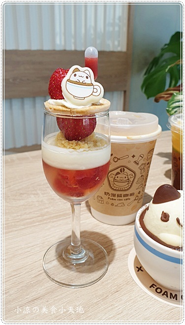 我們點了黑糖拿鐵、水果茶、奶泡貓提拉米蘇、草莓慕斯杯