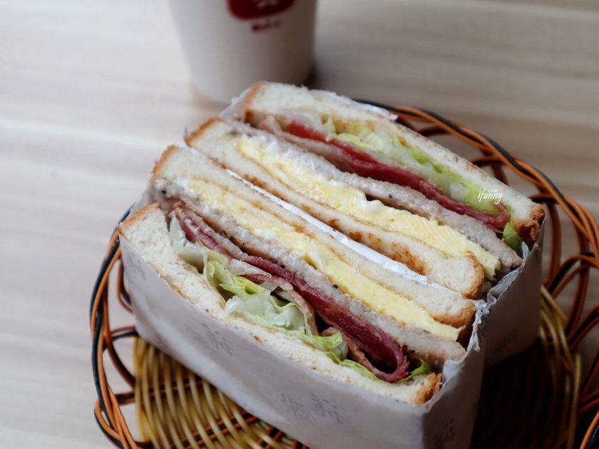 每份吐司都會以有LOGO的防油紙包起來,然後再對切,內用時會用竹籃子裝吐司。豐富的餡料,令人覺得很滿意!