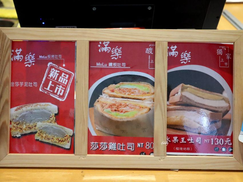 滿樂鐵板吐司在櫃檯上方有許多餐點的照片,看起來都很可口!除了吐司,也有可頌的選項。