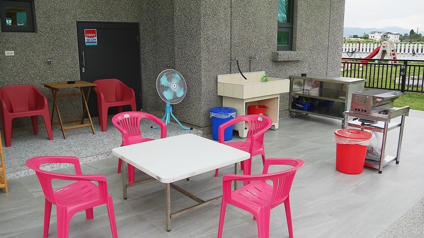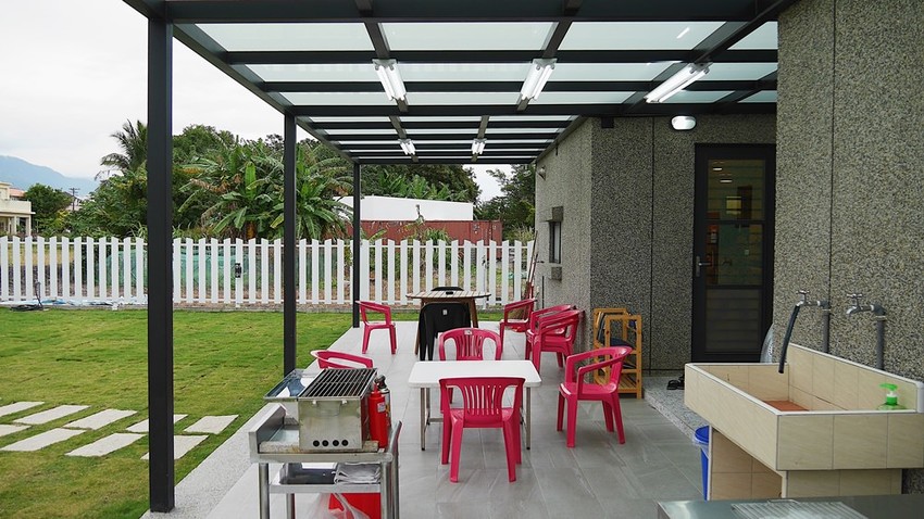 進入民宿前先環繞建築參觀了一圈,後面就是老闆規劃給客人使用的烤肉區。像有些家族旅遊在入住時會想要烤肉,可以請小管家幫忙準備食材和各種用具,費用部分可以依照需求來客制化調整。後院還有採光罩和水龍頭能使用相當方便,但唯一建議的是民宿在開闊的田野上,冬天風比較大時這樣吹就會覺得有點冷,如果旁邊有加裝防風布我想就能解決