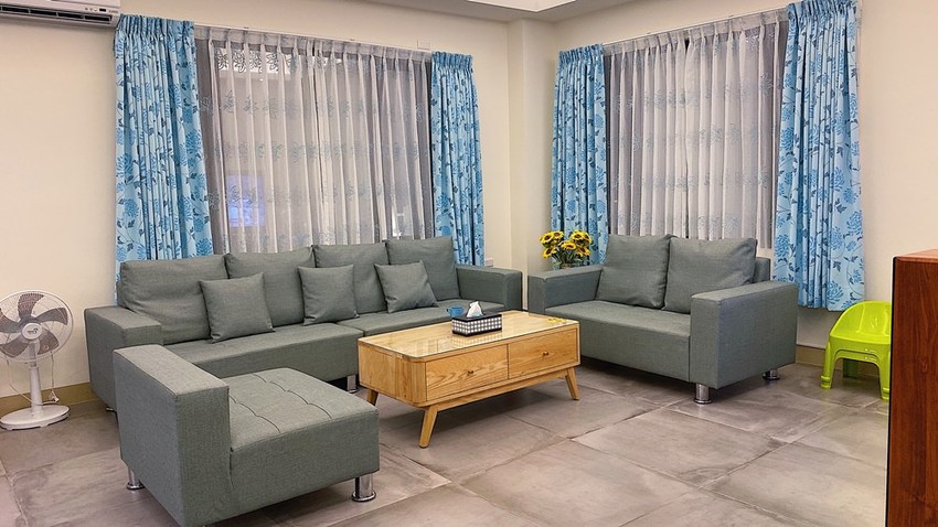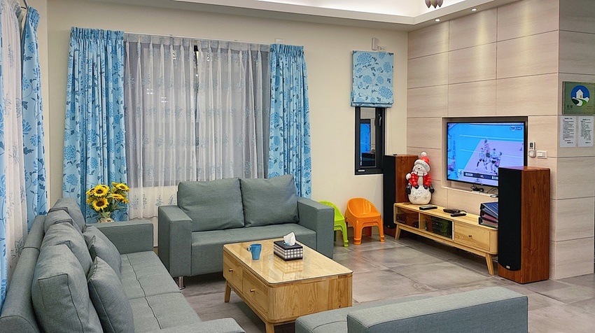從整理好後不到半年的冠冕夢想館,沙發都是新的且是我很喜歡的銅綠色,老闆在客廳還準備好影音設備可以歡唱。但小管家有提醒說因為附近還有住家,歡唱時間請在早上10點到晚上10點。地板這麼寬如果要玩桌遊也方便