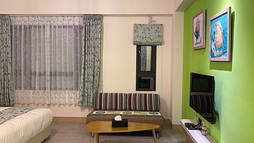 三樓綠色調牆面的另一間四人房,配置和坪數都和剛剛海洋風格相同,就是只有少了能夠泡澡的浴缸,床墊睡起來是中間偏軟滿舒服的
