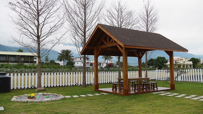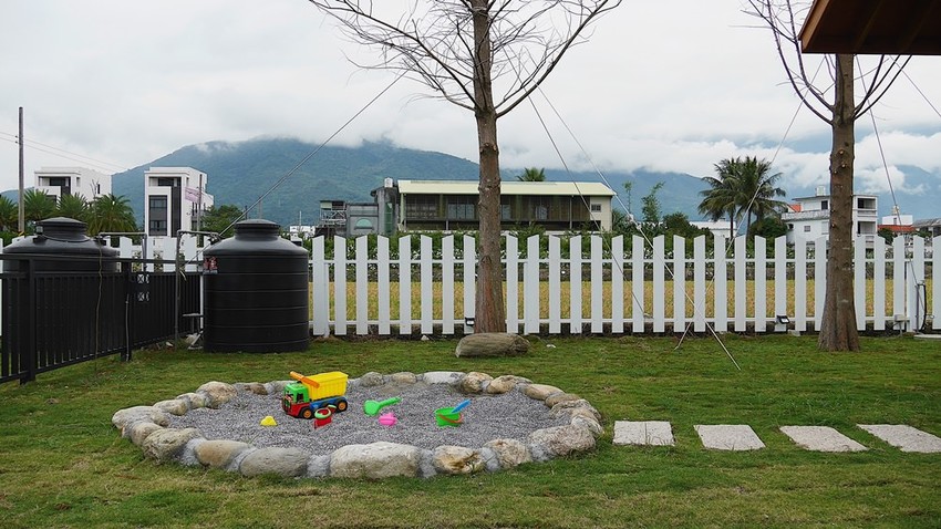 也因為是主打包棟親子民宿的關係,後院還特別圍出一塊沙坑讓小朋友玩沙,甚至玩具都已經準備好了不需要自備。木頭搭建的涼亭可以三五好友在這閒聊,或當作放風爸媽的休息區也挺適合的