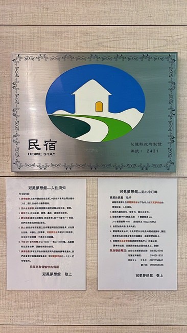 進門矮桌上就放著一整排旅遊資訊,如果有需要也可以請管家幫忙代訂票卷,花蓮民宿通常都會跟業者有合作關係,甚至租借機車也能事先請他們幫忙。牆壁掛著我很重視有沒有合法的鐵牌,底下注意事項表上也有些叮嚀提醒,畢竟民宿對面就是一整排的住家,所以就算包棟也還是要尊重別人喔