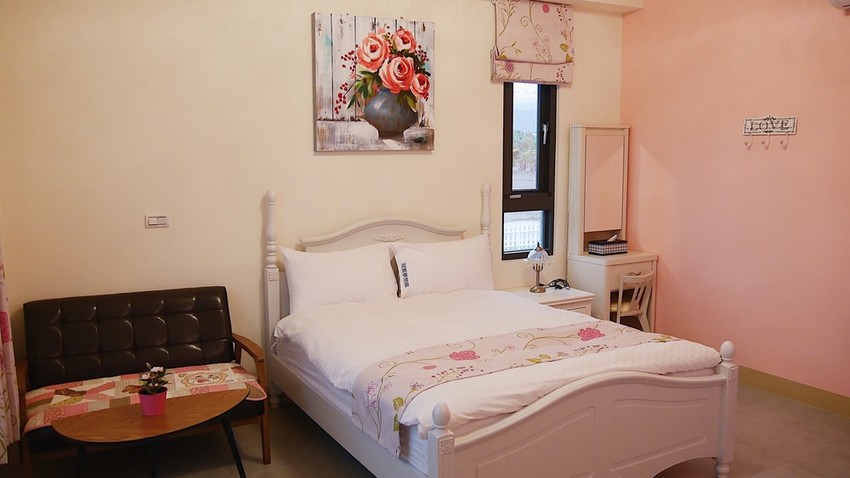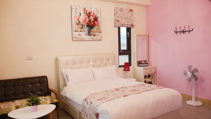 另外在二、三樓也各有一間雙人房,都是以這種粉紅色系的風格為主,旁邊都有沙發能坐著吃零食看電視