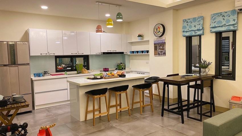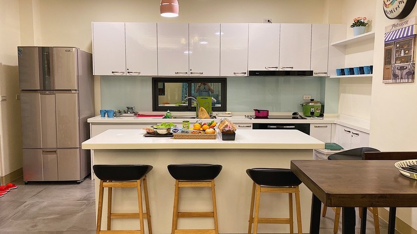 喜歡這種中島設計的開放式廚房,除了可以直接取代餐桌的設計之外,讓平面空間在視覺上都變大了,如果需要烹煮食材電磁爐也可以煮,櫥櫃裡面鍋碗瓢盆都能拿起來用