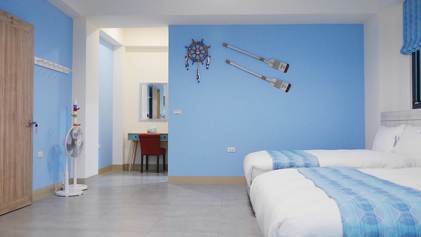位於二樓藍色海洋風格的四人房型,也是整棟民宿唯一有泡澡浴缸的房間。房間大到出現回音也是有誇張到,烤完肉回房間能舒服的泡個熱水澡