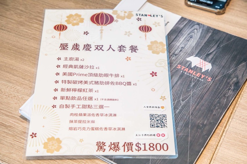 史坦利美式牛排-大江店的料理種類相當豐富,除了有經典排餐外,還以義大利麵、美式漢堡的選校,也有單點經典美式開胃菜及下酒好菜,點主餐可加價升級為套餐,建議升級set B有手工甜點超划算,另外因應年節也推出了壓歲慶雙人套餐