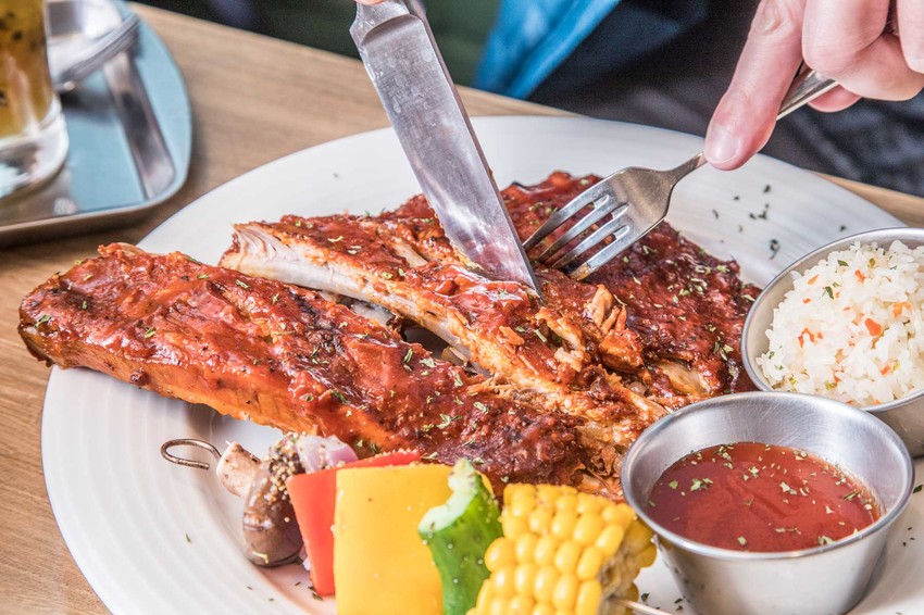 肉鬼控必點!濃郁的燒烤肉香氣不斷襲來讓人食指大動!拿起刀叉直接將肋排一根根的切下來,肋排的肉質相當軟嫩,外層烤到微微的帶點焦香,並且有著濃郁的烤肉醬燒的香味,一口咬下肋排,輕輕鬆鬆骨肉分離,豬肋排的肉質相當厚實,塗上美式醬汁炙烤,入口柔嫩肉汁滿盈