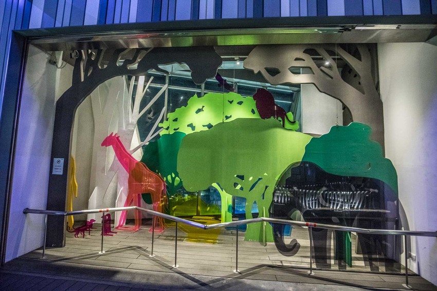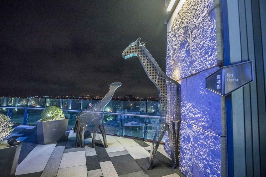 天空廊道是一個室外開放式的空間,這裡也有許多拍照的景點,像是長頸鹿、大象等等,還有趣味的洞移動,可以利用牆上的圖案來拍攝有趣的照片唷
